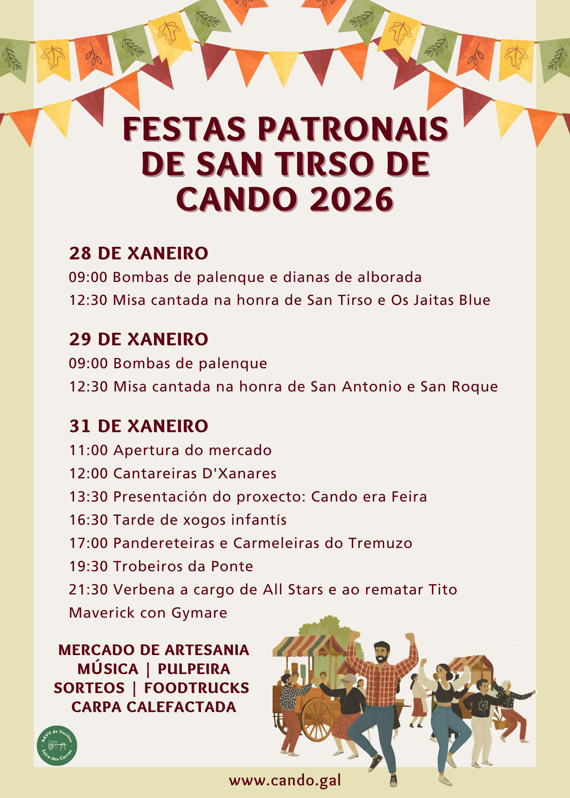 Únete á celebración da nosa tradicional feira e festa en honra ao patrón San Tirso. Un día completo de cultura, tradición e convivencia.
